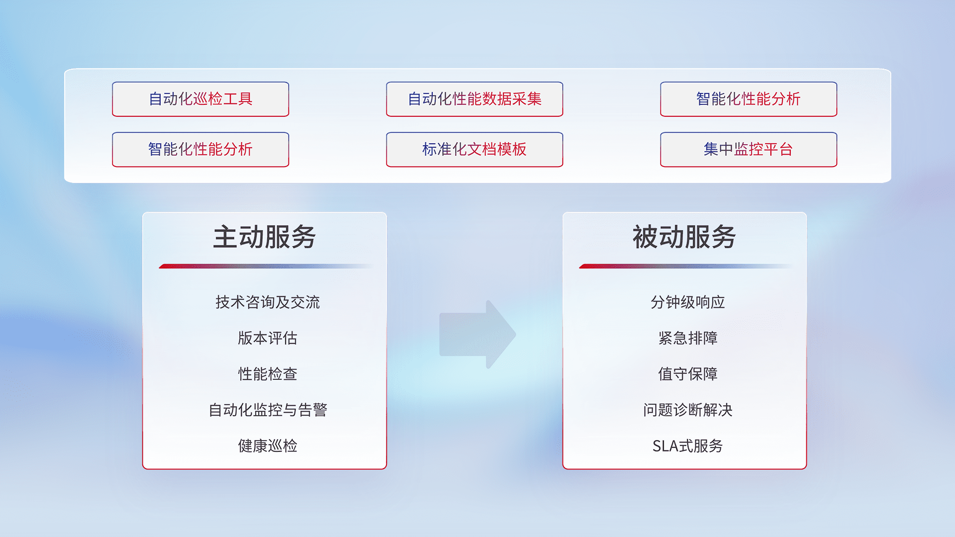 智能化工具和标准化文档,,,,保障服务质量,,,提供主动服务(包含技术咨询、、、、版本评估、、性能检查、、、、自动化监控与告警、、健康巡检)和被动服务包含(分钟级响应、、紧急排障、、、、值守保障、、、、问题诊断解决、、、、SLA服务)。。。